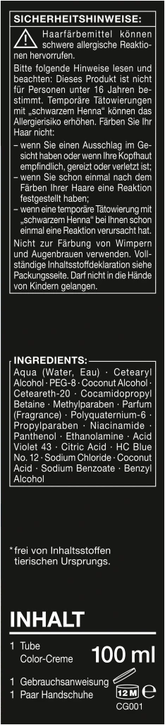 Haarfärbemittel können schwere allergische Reaktionen hervorrufen. Bitte folgende Hinweise lesen und beachten: Dieses Produkt ist nicht für Personen unter 16 Jahren bestimmt. Temporäre Tätowierungen mit „schwarzem Henna“ können das Allergierisiko erhöhen. Färben Sie Ihr Haar nicht: – wenn Sie einen Ausschlag im Gesicht haben oder wenn Ihre Kopfhaut empfindlich, gereizt oder verletzt ist; – wenn Sie schon einmal nach dem Färben Ihrer Haare eine Reaktion festgestellt haben; – wenn eine temporäre Tätowierung mit „schwarzem Henna“ bei Ihnen schon einmal eine Reaktion verursacht hat. Nicht zur Färbung von Wimpern und Augenbrauen verwenden. Vollständige Inhaltsstoffdeklaration siehe Packungsseite. Darf nicht in die Hände von Kindern gelangen.